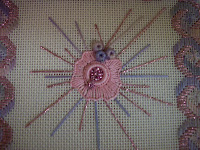 Then, I placed a 1/2 inch ring on the center of the canvas and buttonhole stitched all the way around it, attaching it to the canvas. Next, another ring of buttonhols stitches to create the petal effect around the ring, all using four strands of Splendor. Next, I covered some 5 mm beads with two strands of the Bravo again. She suggested buttonholing all around the bead to attach it to the canvas. Instead, I just wrapped the beads and attached them that way. Next, using two strands of the Bravo, I created the rays around the outside. Then, using a single strand of the Kreinik, I made even more rays. Last, I attached the beads in the center of the flower and spilled them over the top. Below is a closeup of the center. I will frame this later on, and post the final photo for you.