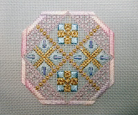 This stitched up fairly quickly. Thanks again to Sharon G for such a great canvas design and she also gets the credit for the idea to use the Japanese gold in the center for the initial.